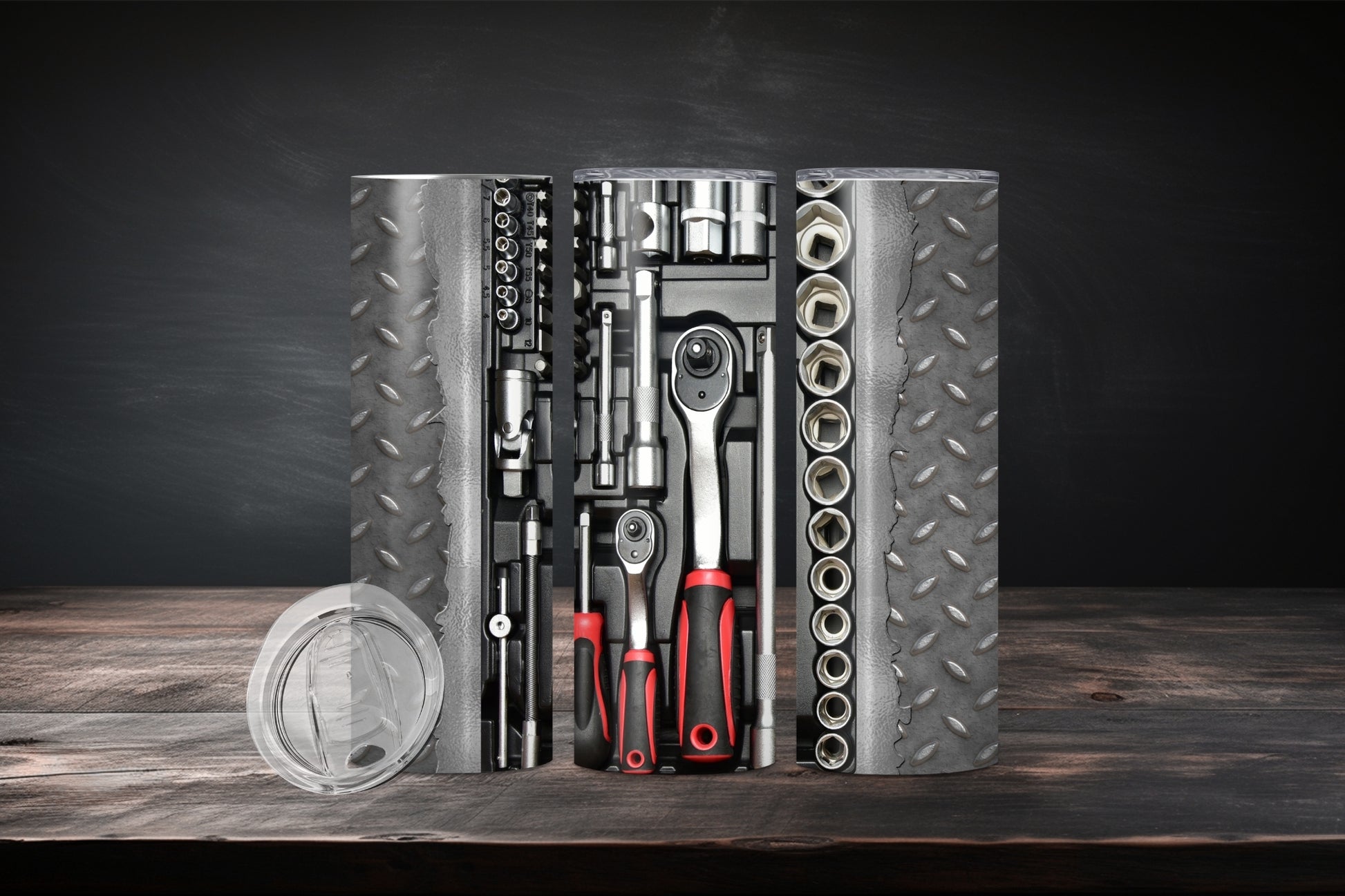 Regular tumbler option is the white base, Stainless Steel option the image is pressed onto the bare stainless. This results in a metallic chrome look that looks great with bright colors and high contrast.